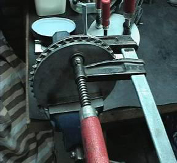 Daarna spannen we de koppelingsplaat(en) tussen ronde platen in de bankschroef.